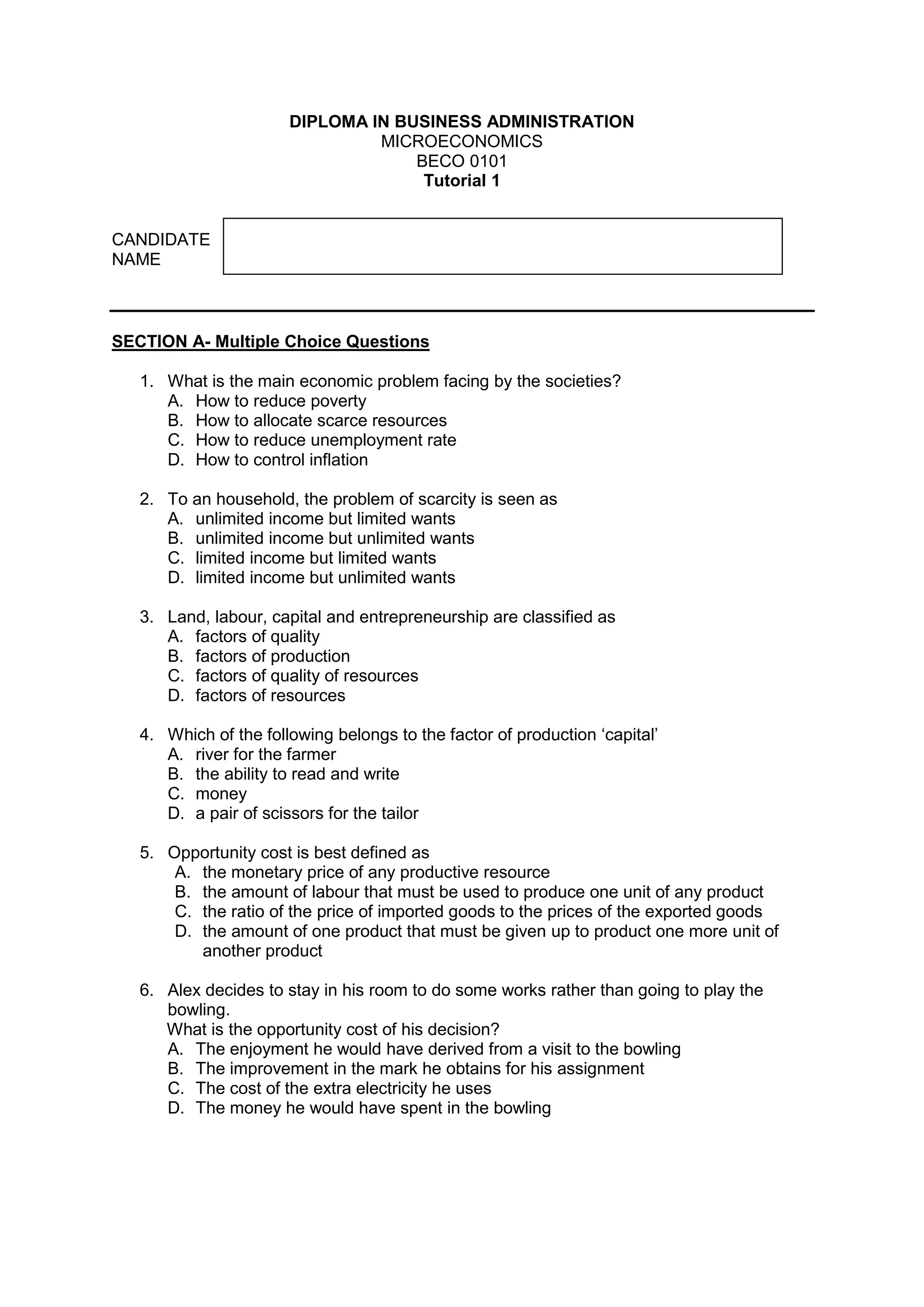 This document contains a tutorial on microeconomics with multiple choice questions and short answer questions. It discusses key microeconomic concepts such as:
