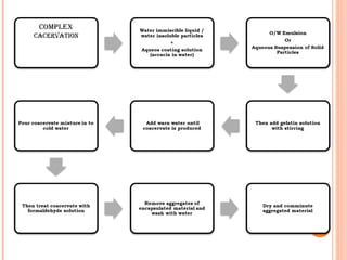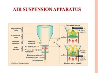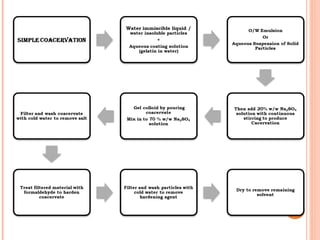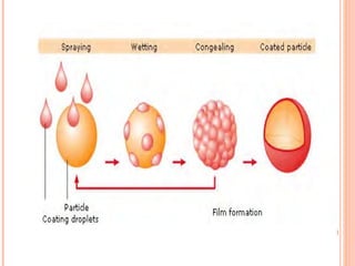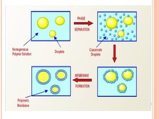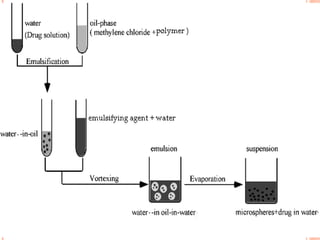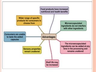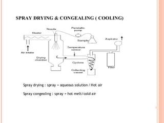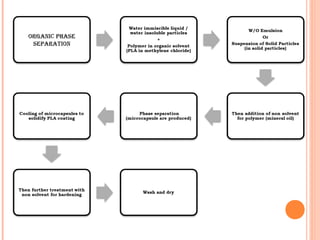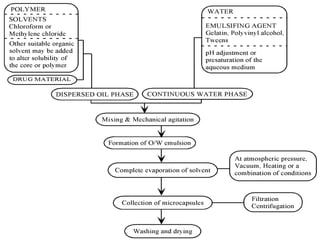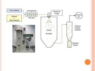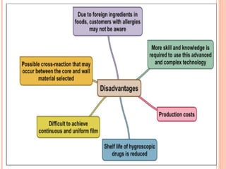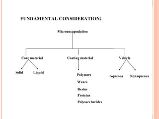 This document provides an overview of microencapsulation. It defines microencapsulation as coating solid, liquid, or gas core materials that are 5-5000 μm in size. Reasons for microencapsulation include sustained release, taste/odor masking, separating incompatible materials, and protecting materials from environmental conditions. Key considerations are the core and coating materials and the release characteristics. Common techniques include solvent evaporation, spray drying, pan coating, and interfacial polymerization. Microencapsulation has various applications and advantages such as converting liquids to powders and preventing gastric irritation, but also has disadvantages like potential toxicity.