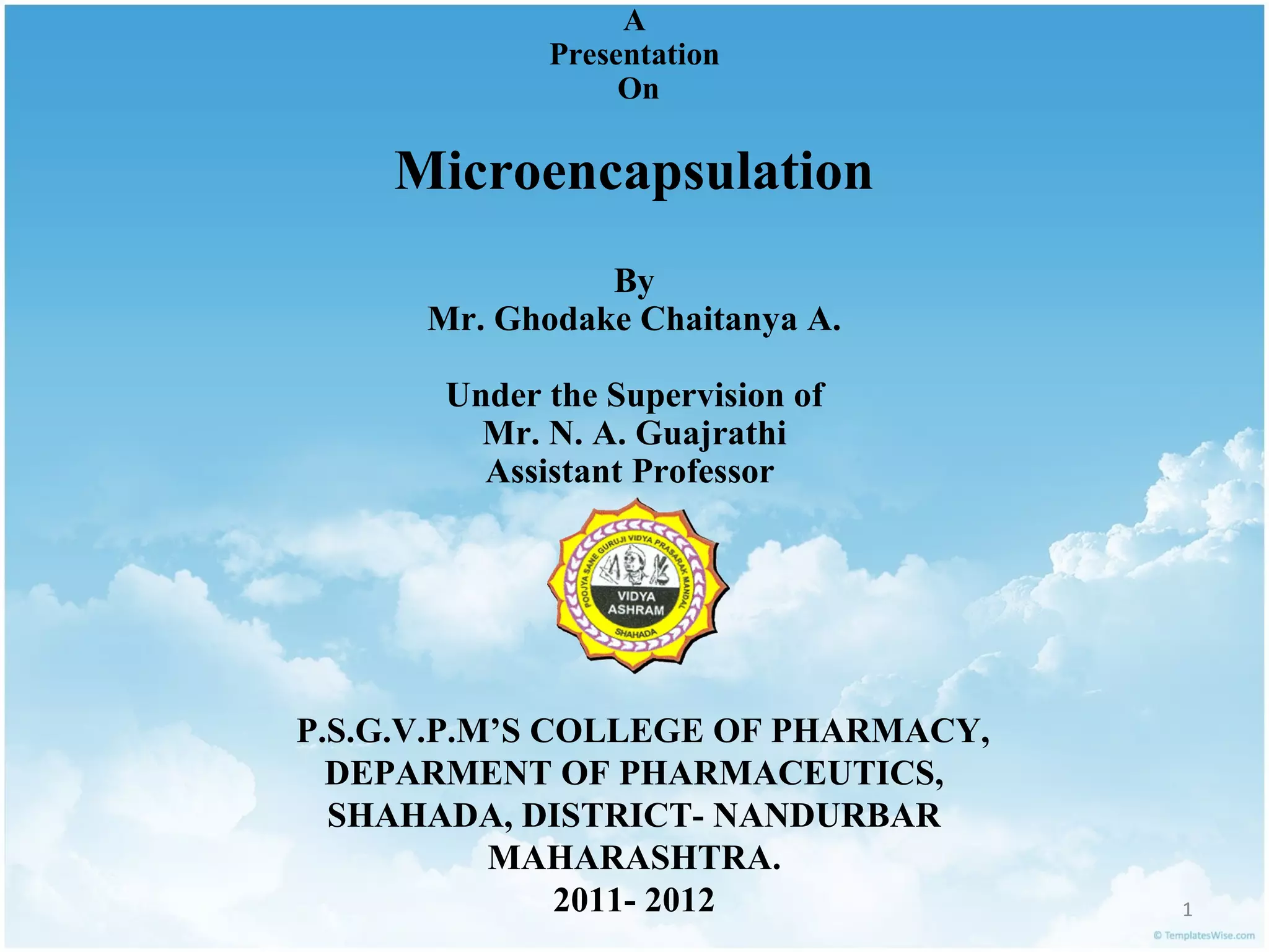The document presents information on microencapsulation including definitions, reasons for microencapsulation, release mechanisms, coating materials and their properties, manufacturing techniques such as air suspension coating and coacervation, and applications. Microencapsulation is described as applying a thin coating to small particles or droplets to form microcapsules or microspheres ranging from less than one micron to several hundred microns in size. Common techniques for manufacturing microencapsulates include physical methods like pan coating and spray drying as well as chemical processes like solvent evaporation and polymerization.