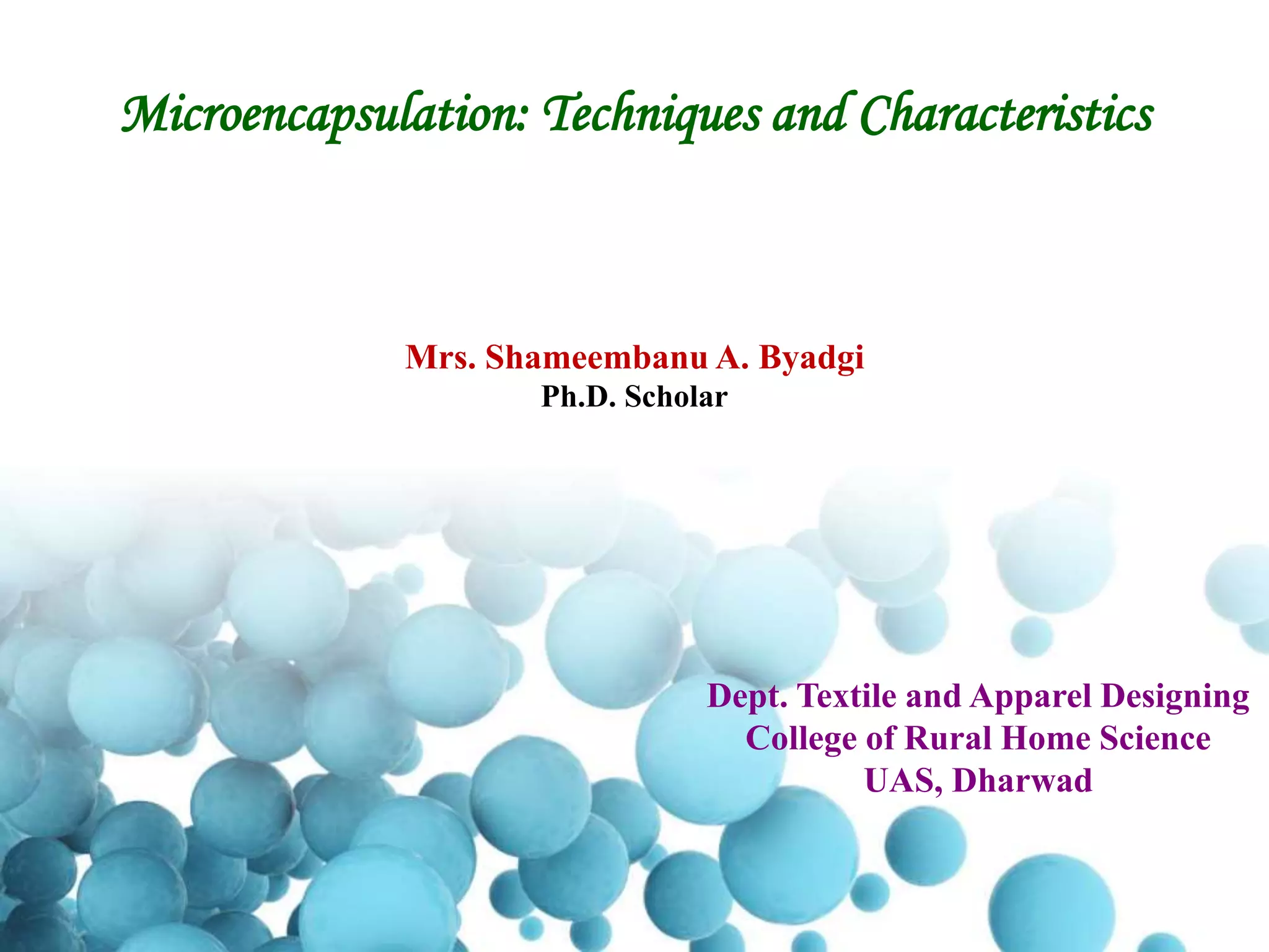 Microencapsulation is a process where tiny particles or droplets are surrounded by a coating to form capsules ranging from less than 1 micron to several hundred microns. The core material is encapsulated within the coating material and can be released through mechanisms like dissolution, degradation, or diffusion. Microencapsulation has applications in textiles to provide properties like controlled release of active ingredients over multiple washes. Common techniques for developing microcapsules include coacervation, spray drying, and solvent evaporation. Microcapsules are characterized using tools like particle size analysis, SEM, and AFM.