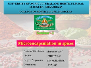 The document presents a seminar on microencapsulation in spices, detailing its definition, history, applications, and encapsulation methods. It highlights the need for encapsulation in spices to enhance shelf-life, protect volatile compounds, and improve stability. Additionally, it discusses various coating materials and the challenges involved in selecting appropriate encapsulation materials.