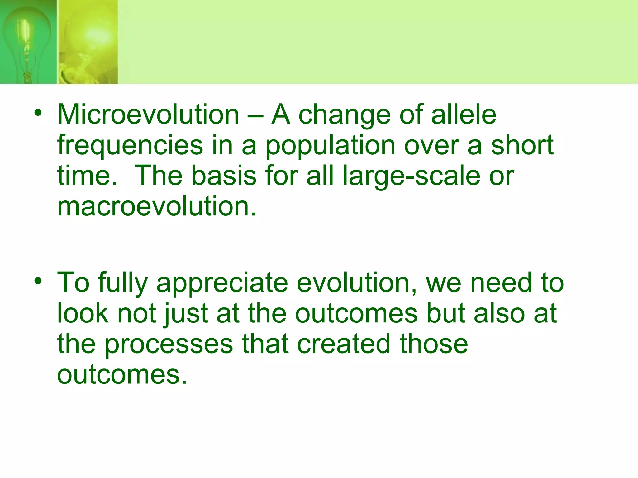 Microevolution is changes in allele frequencies in a population over a short time due to various evolutionary processes. Five agents of change can cause microevolution: mutation, gene flow, genetic drift, non-random mating, and natural selection. Natural selection is the only consistent driver of adaptation, favoring traits that increase an organism's fitness and ability to pass genes to the next generation. Selection can act in three modes: stabilizing selection favors intermediate traits, directional selection moves a trait toward an extreme, and disruptive selection moves a trait toward both extremes.