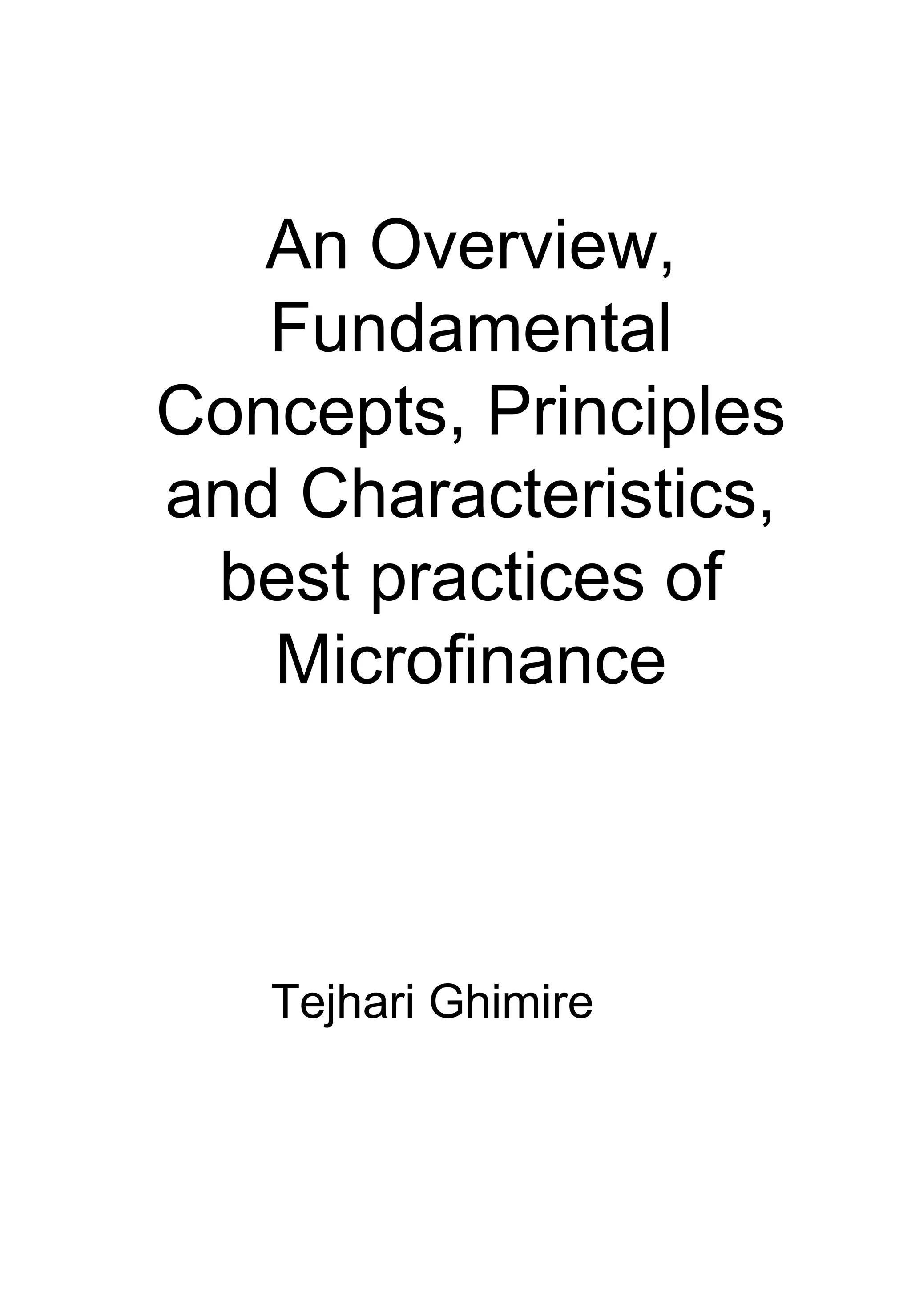 The document provides an overview of microfinance concepts, principles, characteristics, and best practices. It discusses that microfinance aims to provide financial access to low-income groups through loans, savings, and other services. Key principles include understanding the market, streamlined operations, repayment incentives, and sustainable interest rates. Characteristics are collateral-free and small loans with flexible terms. Best practices are effective management systems, financial sustainability, and involving clients.