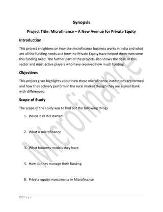 This document provides a table of contents for a project on microfinance and private equity investment. It outlines the objectives of studying the evolution of microfinance, business models, funding needs, and private equity deals in India. Microfinance institutions face acute funding shortages due to delayed loan repayment cycles. The research aims to understand this growing sector and investment opportunities despite challenges like over-indebtedness of borrowers. Various sources are referenced to collect data on microfinance institutions, regulations, and deals in India.