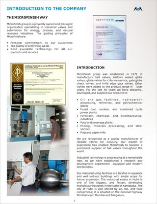 Microfinish Group specializes in industrial valves and automation for energy and process industries, established in 1971, with a comprehensive portfolio including various types of valves and certifications such as ISO 9001 and API 6D. The company emphasizes quality assurance and in-house manufacturing from its facilities in Hubli, India, while also expanding its presence in the Americas through Microfinish Valves, Inc. in Houston, Texas. Their product range includes advanced automation systems for valves, catering to sectors like oil and gas, power, and chemicals.