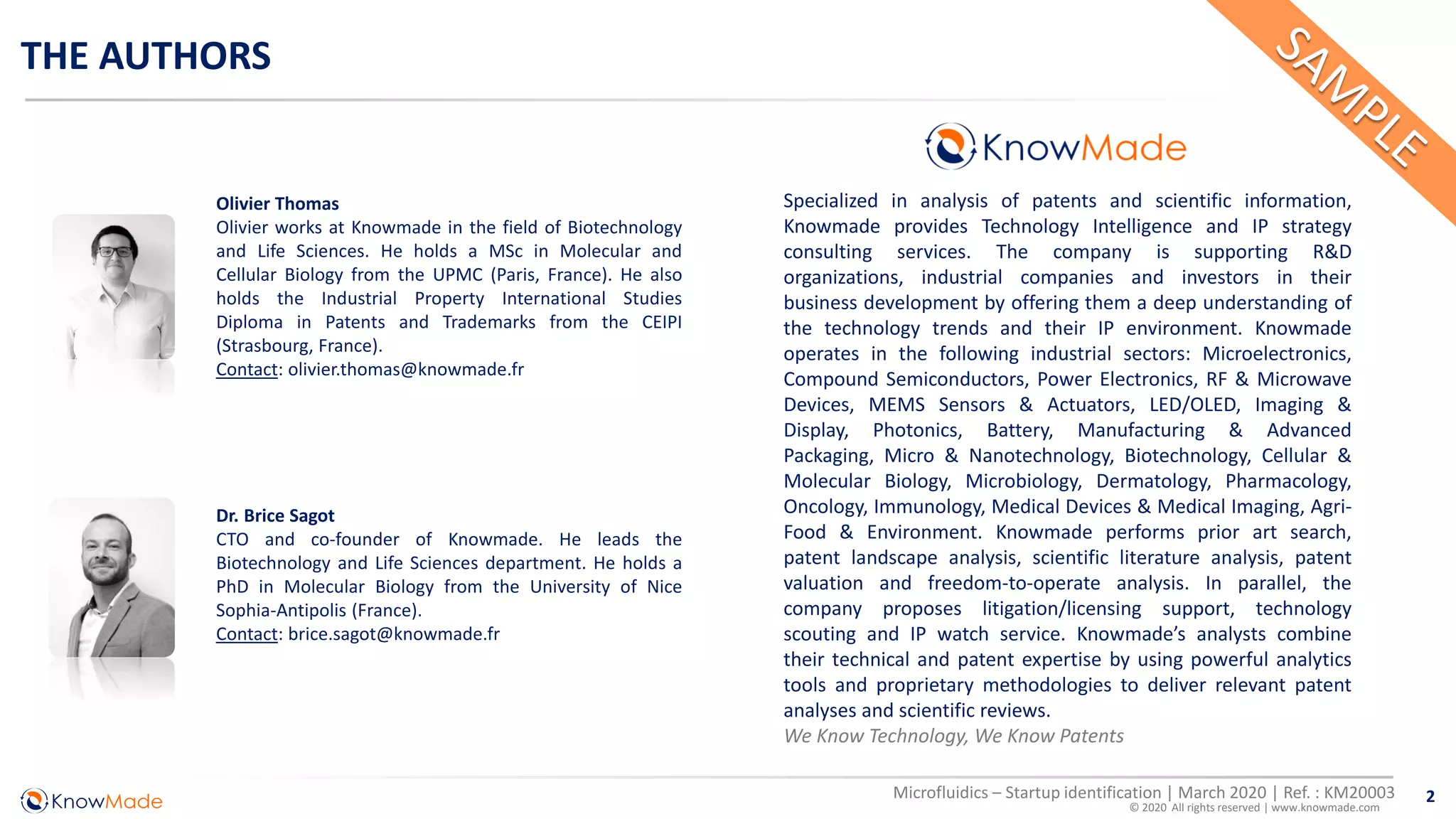 The document provides an analysis of startups in the microfluidics sector, including their patents, products, and key personnel. It aims to help identify new business opportunities, assess technology, and understand market trends and competitors. The report includes extensive data and insights supported by patent analysis and is delivered electronically upon purchase.
