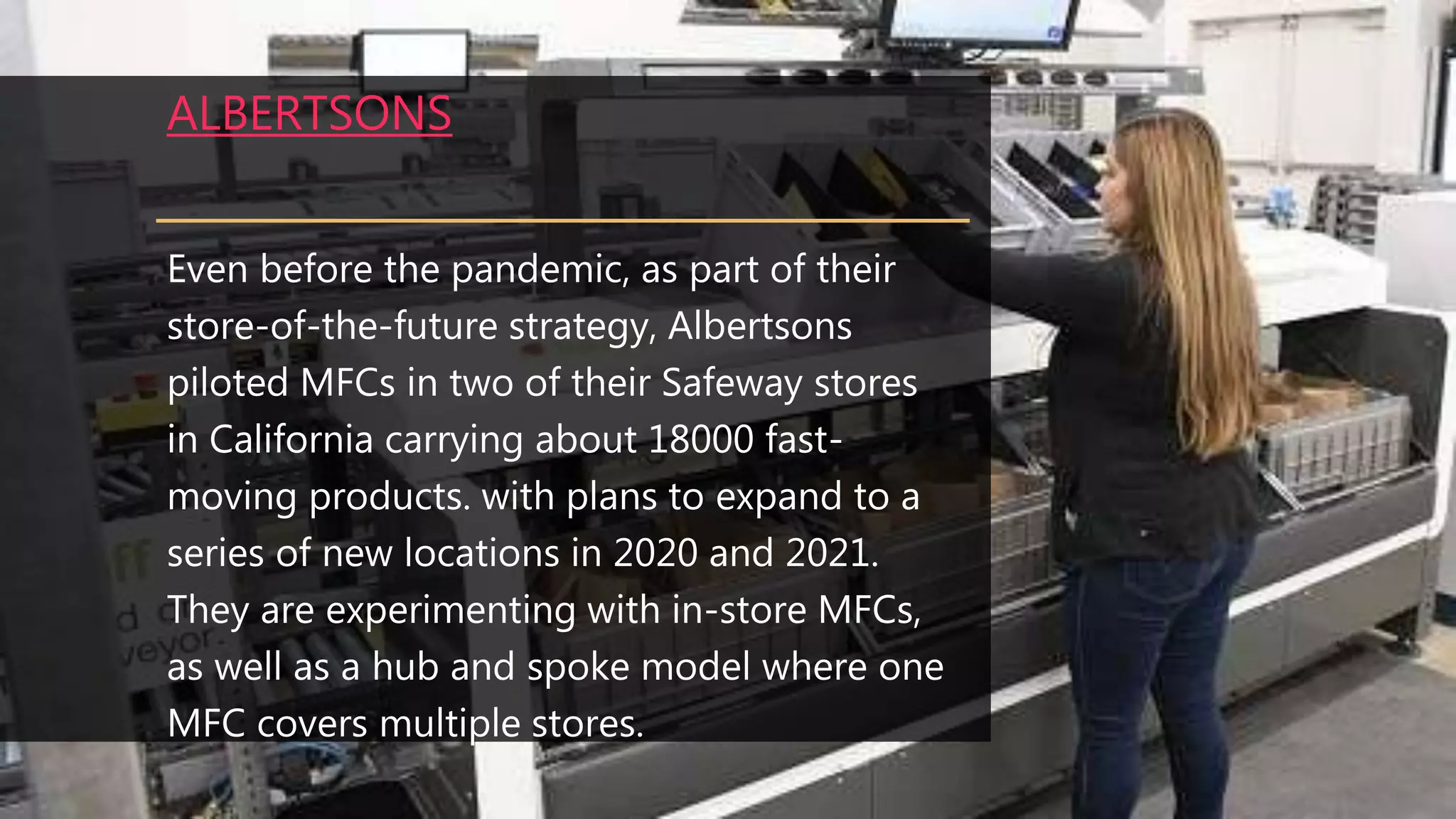 The document discusses the implementation of micro-fulfillment centers (MFCs) by various grocery chains to enhance e-commerce capabilities. Albertsons, Loblaws, Shoprite, Kroger, Walmart, and PepsiCo are exploring automated solutions to meet growing online grocery demand, improve fulfillment efficiency, and reduce costs. These initiatives include partnerships with technology providers and the adaptation of existing facilities for online order fulfillment.