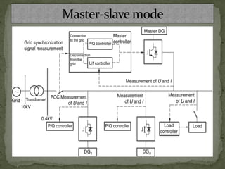 1. Master-slave mode where one DG acts as the voltage/frequency master and others follow as slaves under P/Q control.