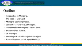 This document presents information on power generation using microgrids. It defines a microgrid as a small-scale power supply network designed to provide power for a small community using local power generation and loads. Microgrids have several components including distributed generation sources, loads, storage, a controller, and a point of common coupling. Microgrids can operate in grid-connected or island modes. They provide more efficient, reliable, and environmentally friendly power compared to conventional grids. Future research aims to increase microgrid stability and affordability so they can replace conventional grids and facilitate greater renewable energy use.