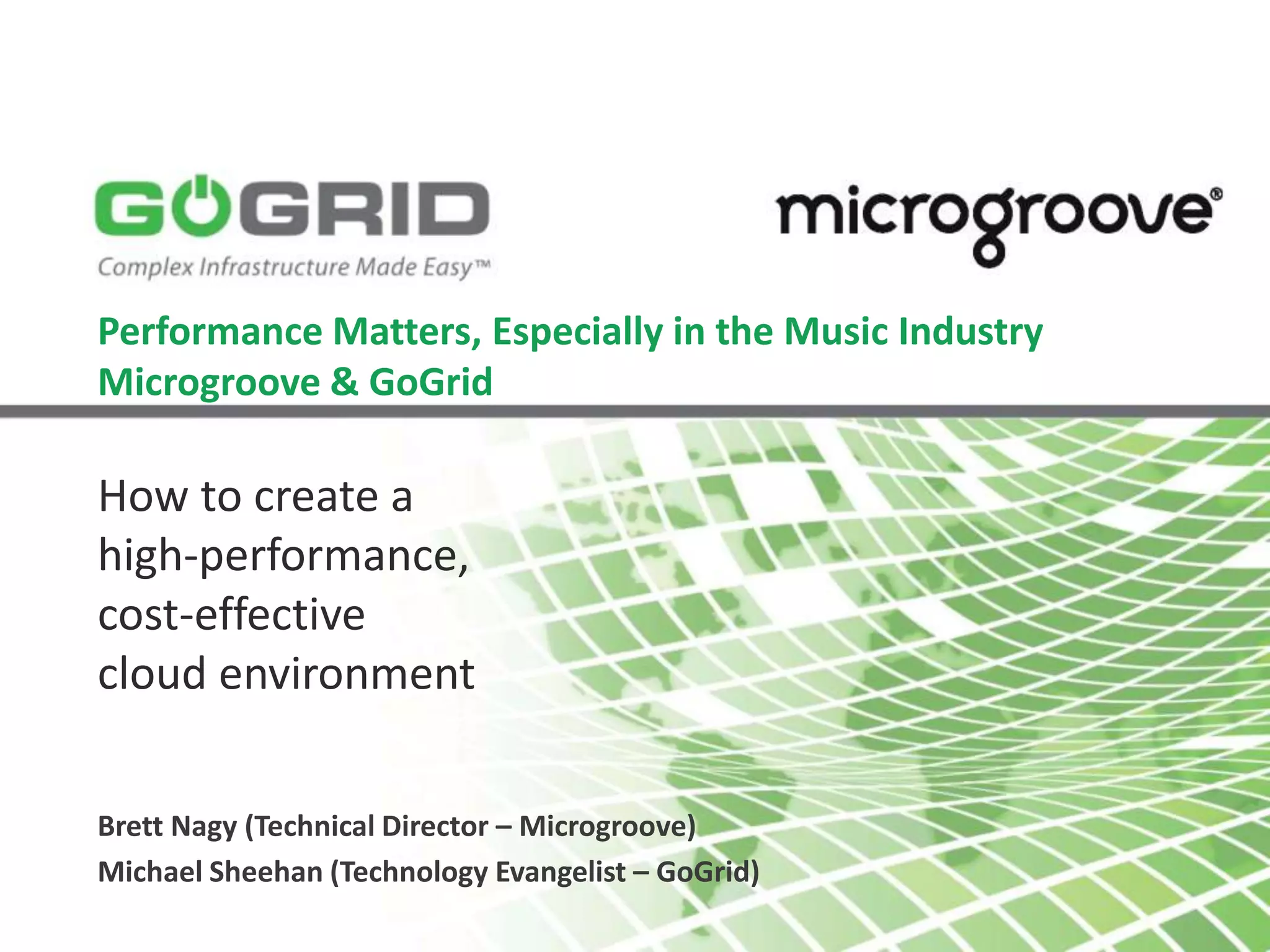 The document outlines the collaboration between Microgroove and GoGrid to develop a high-performance cloud environment optimized for the music industry, enabling rapid deployment and efficient management of extensive content for major recording artists. Microgroove transitioned from self-hosting to GoGrid's infrastructure, resulting in increased scalability, reduced onboarding time for new customers, and enhanced performance metrics. Key takeaways include maintaining dedicated hardware for predictable performance and avoiding unnecessary re-architecture when moving to the cloud.