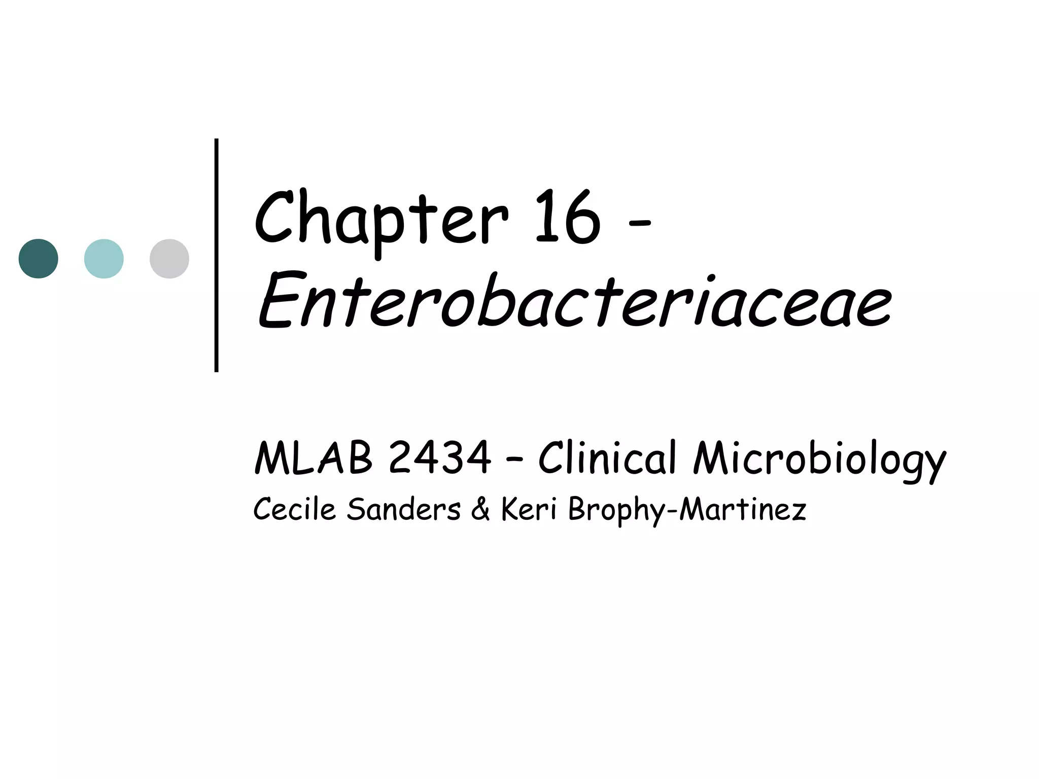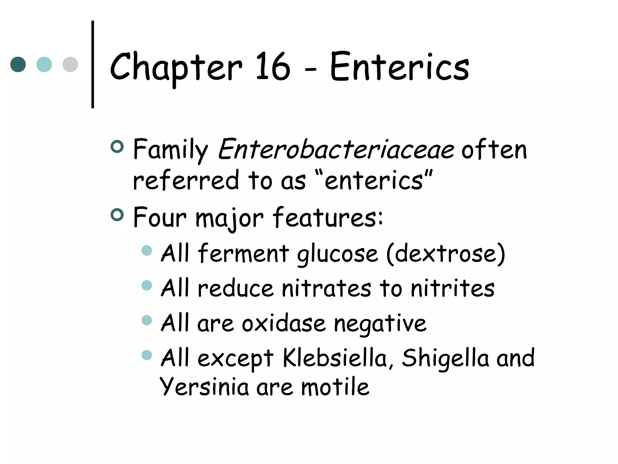 This document provides an overview of the Enterobacteriaceae family of bacteria, including their classification, characteristics, clinical significance, and important pathogenic species such as Escherichia coli, Klebsiella, Salmonella, Shigella, and Yersinia. Key features of Enterobacteriaceae include being Gram-negative, non-spore forming bacilli that are oxidase-negative, reduce nitrates to nitrites, and ferment glucose. They can cause a variety of opportunistic infections and some are primary intestinal pathogens. The document describes the microbiological properties and diseases associated with major pathogenic genera.
