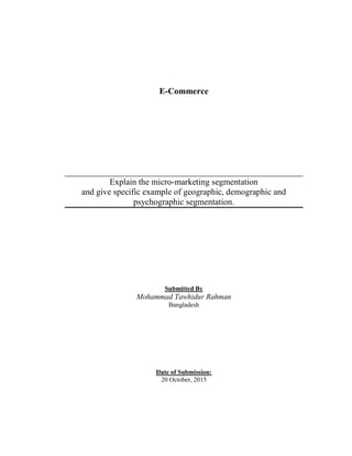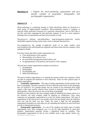The document explains micro-marketing segmentation, focusing on how it targets small groups of consumers based on specific characteristics like geography, demographics, and psychographics. It details three types of segmentation: geographic (based on location), demographic (based on population variables like age and income), and psychographic (based on lifestyle and interests). The goal is to effectively categorize and market to distinct consumer segments to meet their needs better.