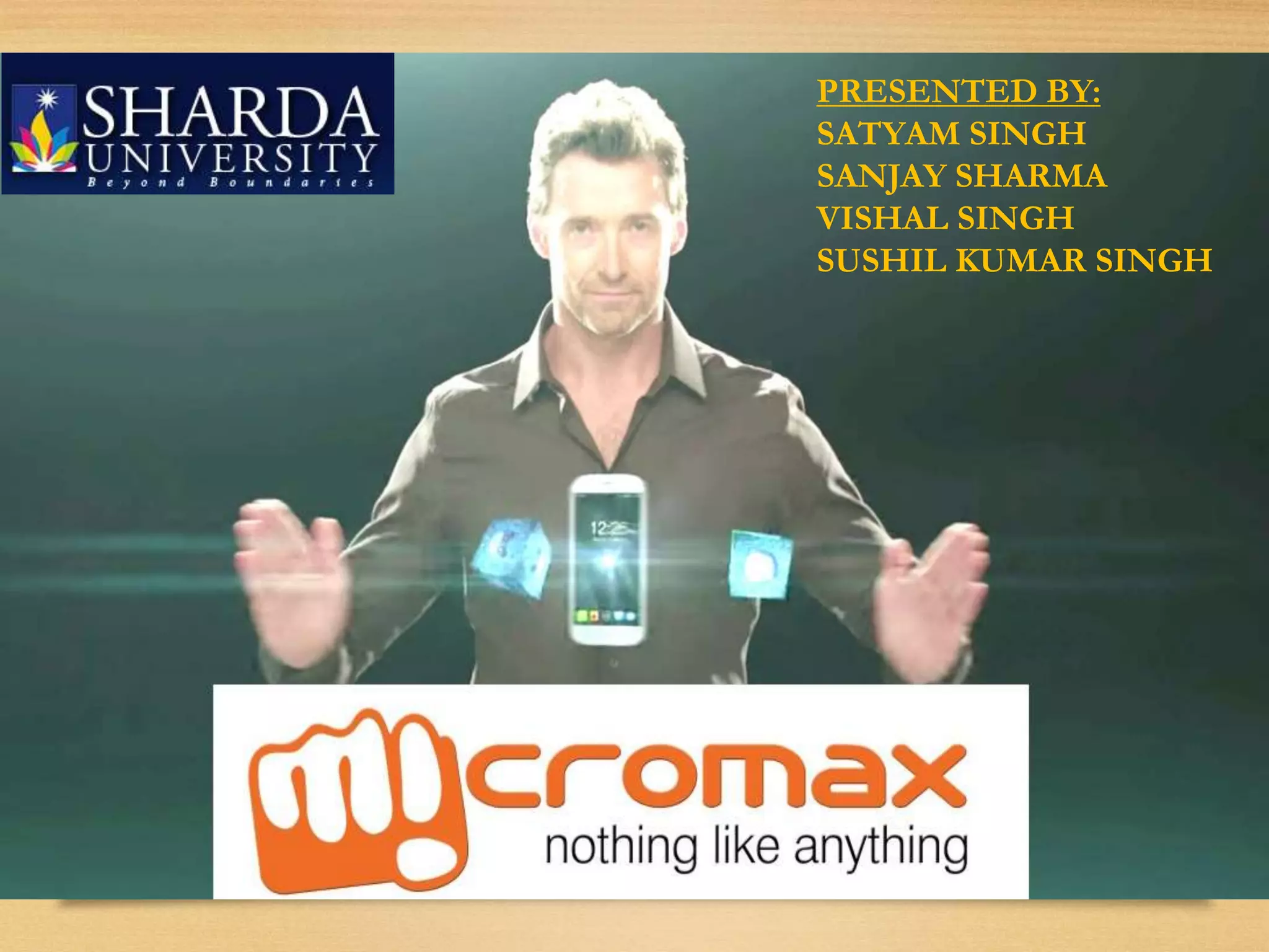 This document presents information about the Indian electronics company Micromax. It discusses that Micromax started as a software company in 1999 and entered the mobile handset business in 2008, becoming the largest Indian mobile company by 2010. It provides key details about Micromax's founders, CEO, product lines including mobiles, tablets, TVs, and market share which is about 1.3 million mobile handsets per month in India. The document also outlines Micromax's strategies to expand in urban and international markets and objectives to focus on urban youth and achieve double digit market share by 2014.