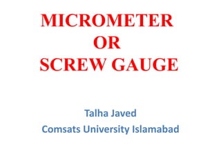 The document describes a micrometer or screw gauge, which is a precision measuring tool invented in 1638. It has two scales - a main linear scale graduated in 0.500 mm marks and a rotating scale with 50 divisions each equal to 0.010 mm. To take a measurement, the spindle is turned until it contacts the object being measured. The reading is the sum of the values indicated on the two scales. The precision or least count is 0.01 mm, determined by dividing the pitch (distance moved per rotation) by the number of divisions on the rotating scale. Potential sources of error include non-removal of zero error and improper reading.