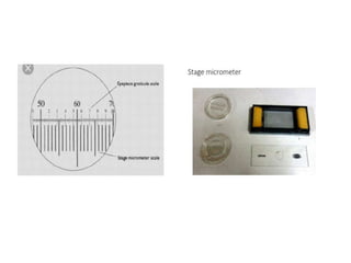 This document discusses different methods of micrometry, which is the measurement of microscopic objects under a microscope. There are two main types of micrometers used: stage micrometers and ocular micrometers. Stage micrometers have finely graduated scales etched onto a slide and are used to calibrate the microscope by observing how many divisions on the ocular micrometer correspond to a known distance on the stage micrometer. Ocular micrometers are discs that are inserted into eyepieces and have their own graduated scales. To measure a microbe, its size is calculated by counting how many divisions it spans on the calibrated ocular micrometer. Micrometry is important in microbiology labs to identify microscopic organisms by measuring their length.