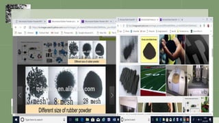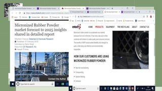 Micronized rubber powder (MRP) is made from grinding vulcanized rubber, mostly from recycled tire material, into a fine powder. It can also be produced from other rubber compounds like nitrile, EPDM, butyl, and natural rubber. The document provides information about MRP and invites questions to an email address.