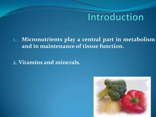 This document discusses vitamin A, including its functions, sources, recommended daily allowance, deficiency, and treatment. Key points include: