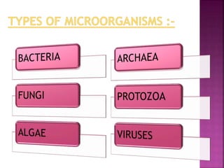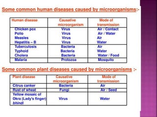 The document provides an overview of microorganisms, describing their diverse forms, habitats, and roles in ecosystems, including the spoilage of food and their use in food production. It discusses the benefits of microorganisms, such as nitrogen fixation and the production of antibiotics, as well as the diseases they cause in plants and humans, highlighting the means of transmission and impact on health. Additionally, it outlines various methods of food preservation and details the structure and function of bacterial and fungal cells.