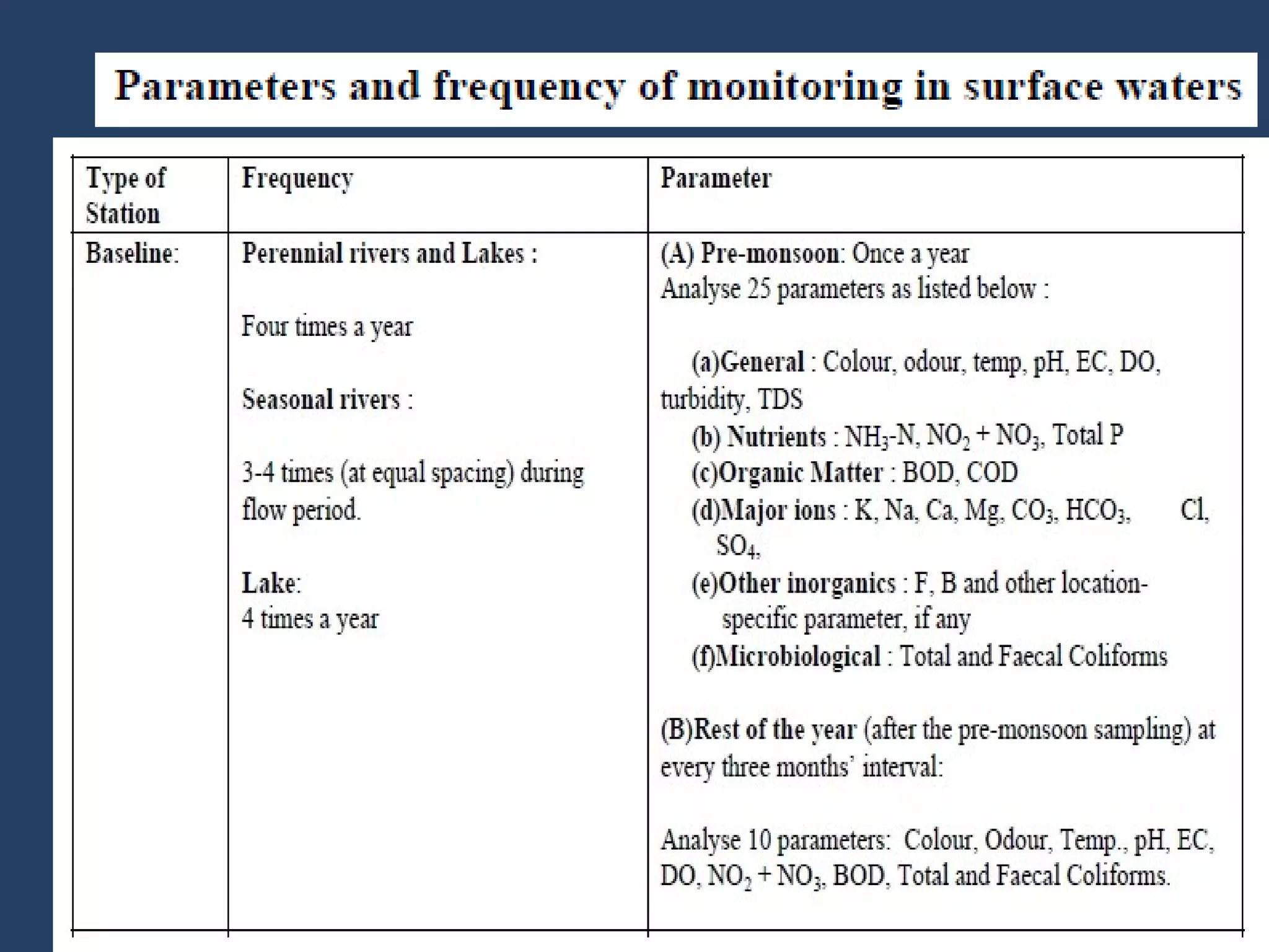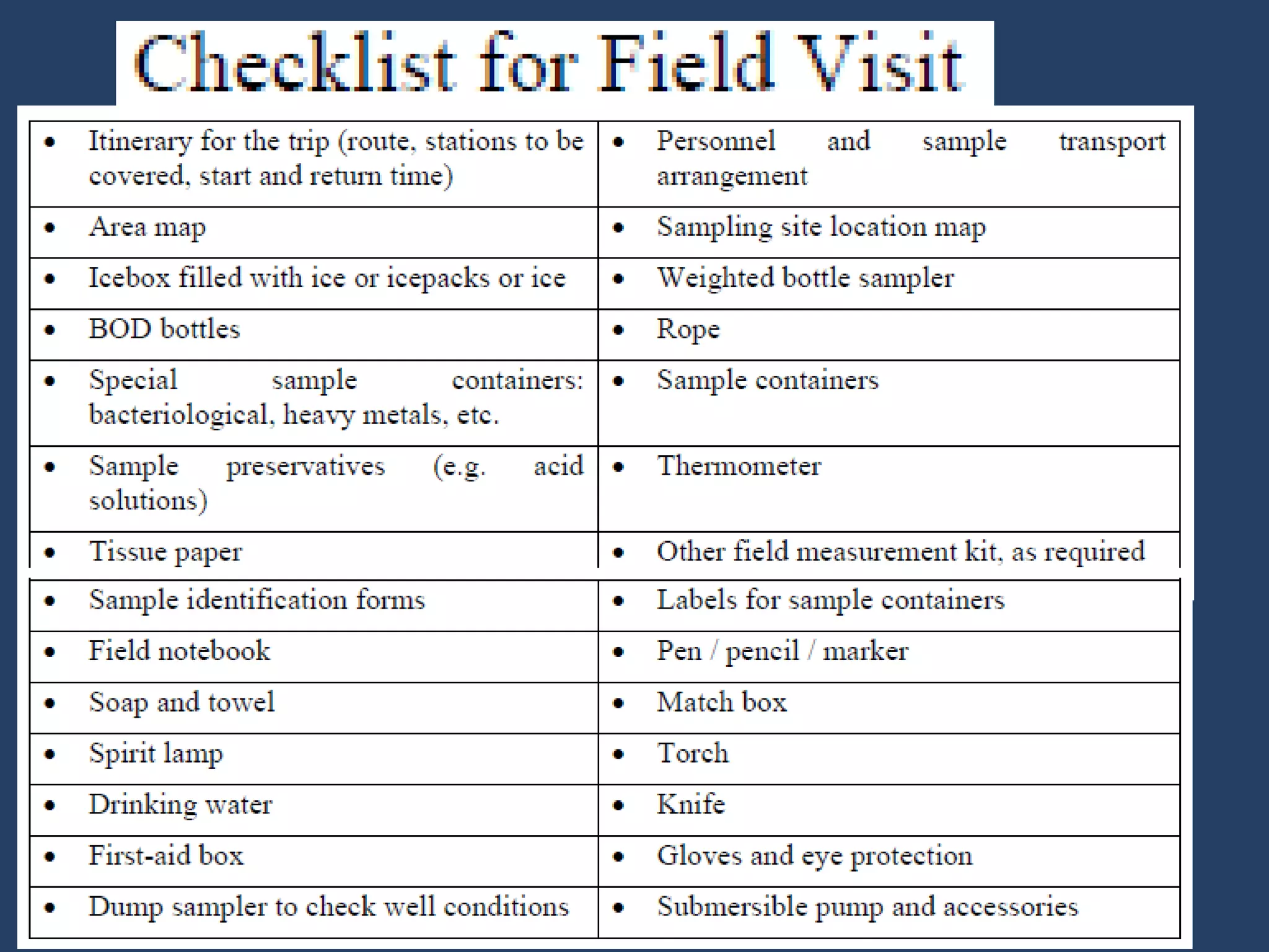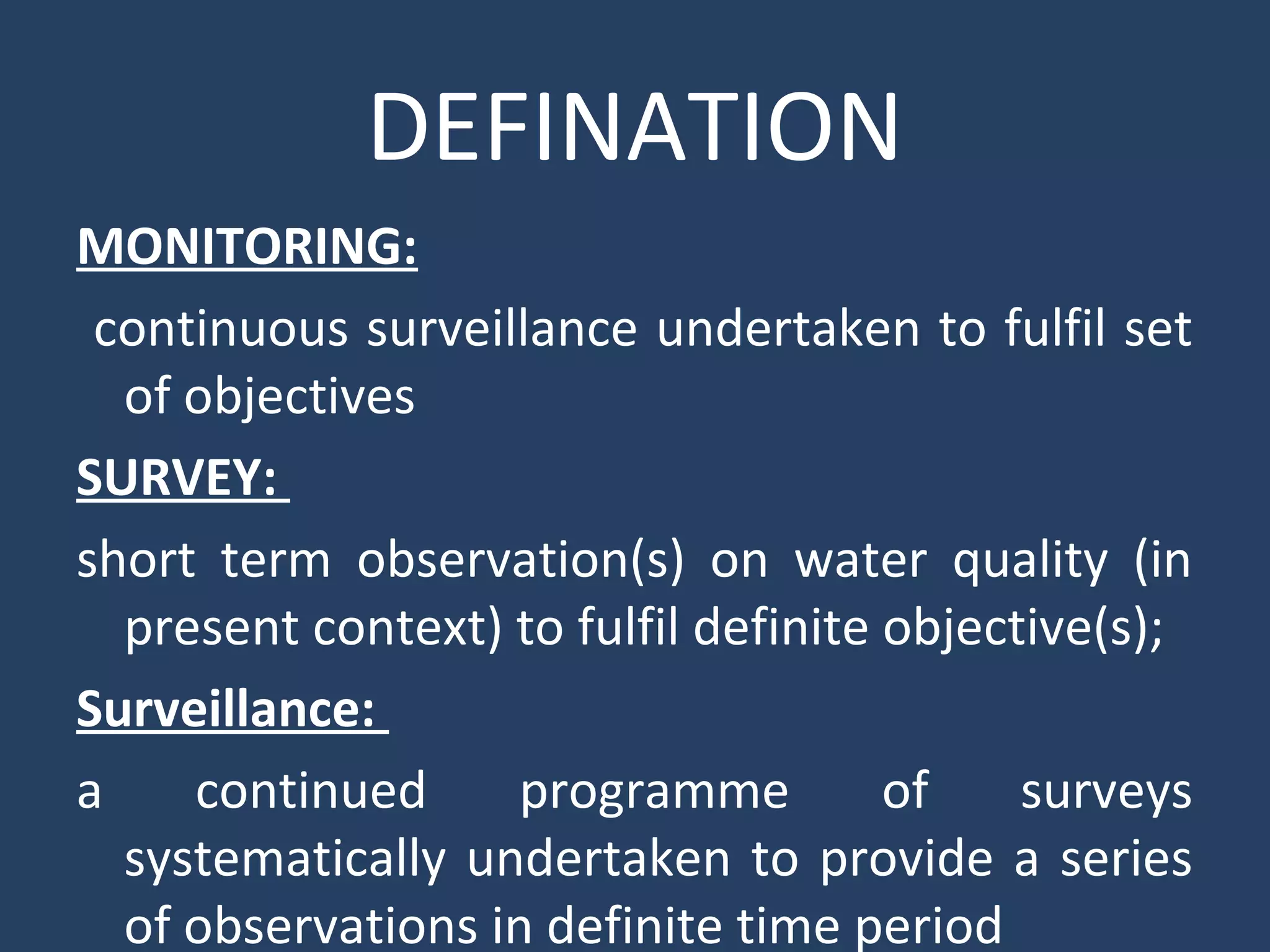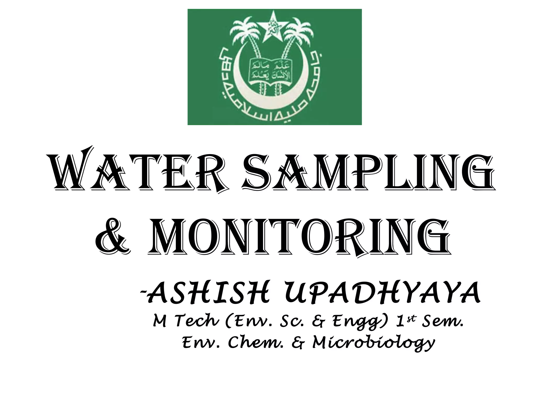 This document outlines the process of water sampling and monitoring. It discusses the definitions of monitoring, survey and surveillance. Water quality monitoring involves 8 steps: setting objectives, assessing resources, conducting a reconnaissance survey, designing a network, sampling, laboratory work, data management, and quality assurance. Sampling involves representative sampling, field testing, sample preservation and transport. Laboratory work includes physical, chemical, microbiological and biological analysis. Data management covers storage, analysis, presentation and reporting. Quality assurance ensures reliable data through quality control and analytical quality control.