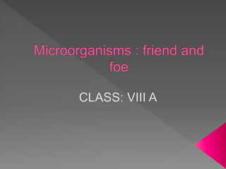 This document discusses microorganisms and their characteristics. It defines microorganisms as living organisms that are too small to be seen with the naked eye, including bacteria, fungi, protozoa, algae, and viruses. It classifies common diseases caused by different microorganisms and describes how microorganisms can be beneficial, for example in food production, or harmful as pathogens. The document also explains how pathogens spread communicable diseases and how the human body develops immunity against diseases.