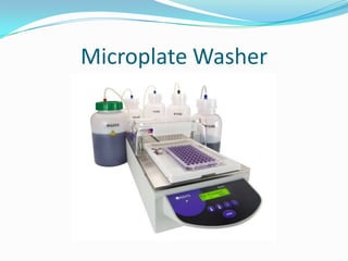 The document provides a detailed overview of microplate washers used in the ELISA technique, outlining their operation, components, and maintenance requirements. Key subsystems include control and supply systems for washing solutions, as well as extraction mechanisms for fluid removal. It also emphasizes the importance of proper calibration, installation in a clean environment, and routine maintenance to ensure effective performance.