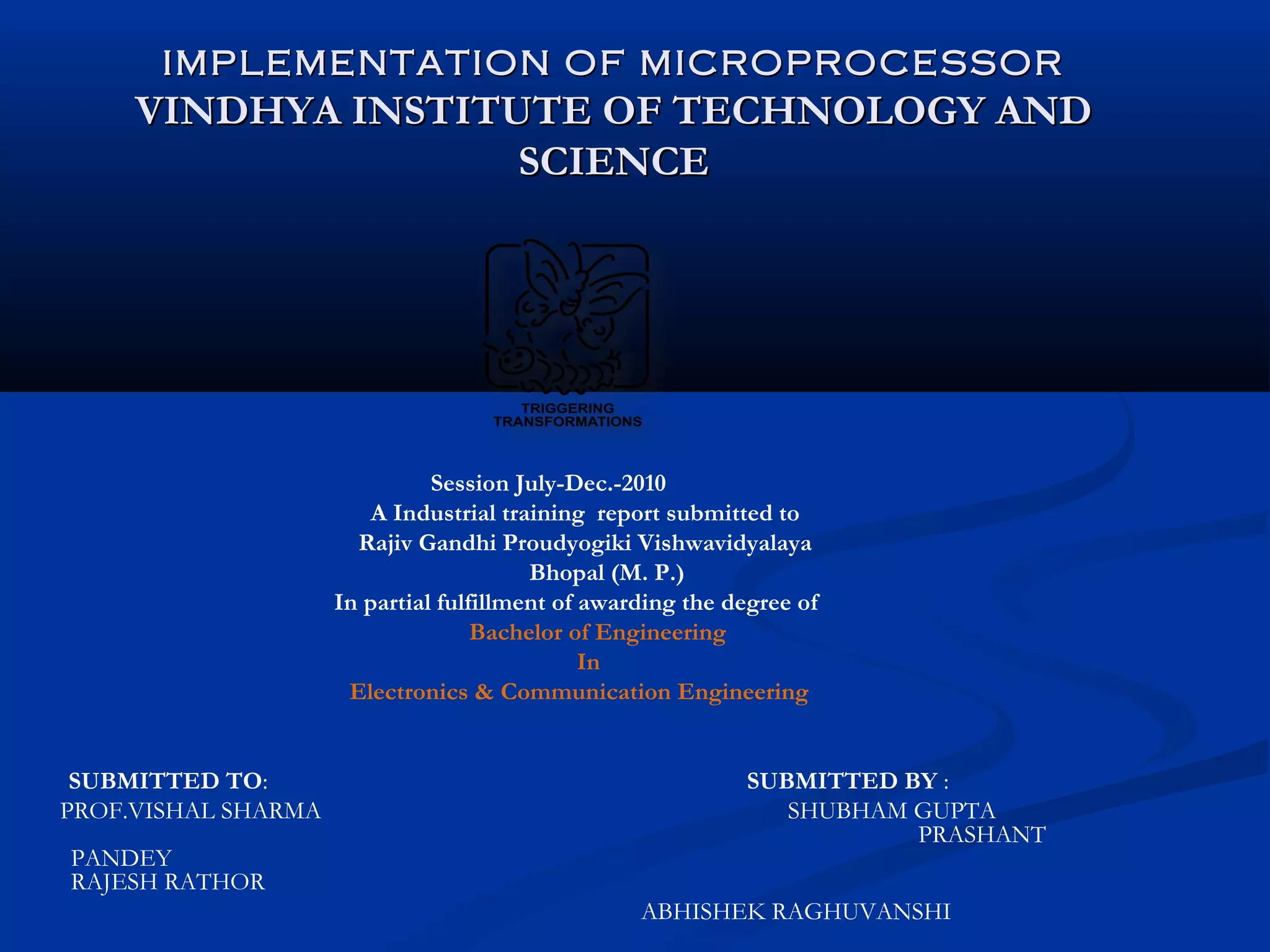 The document describes the implementation of a 16-bit microprocessor core called "MIB-16" using VHDL. It discusses designing the various components of the microprocessor like the ALU, control unit, registers etc. separately in VHDL, simulating them and then implementing the entire design on an FPGA. The microprocessor can access 64KB of memory and execute instructions like addition, subtraction etc. VHDL allows for modeling digital systems at different levels of abstraction and the microprocessor design demonstrates its use for designing an entire processor.