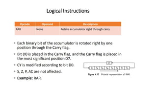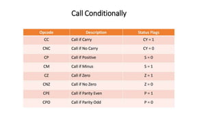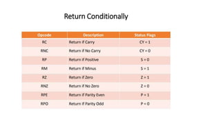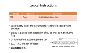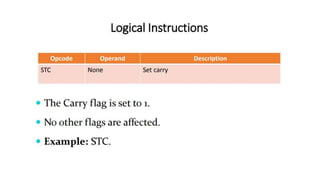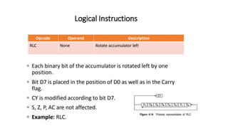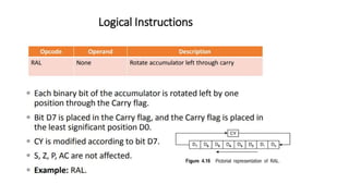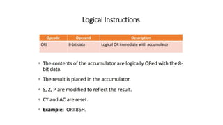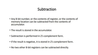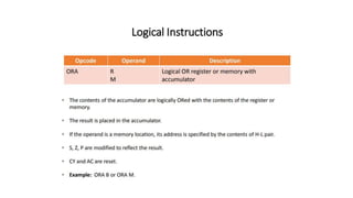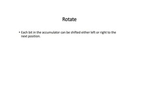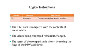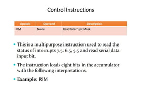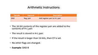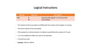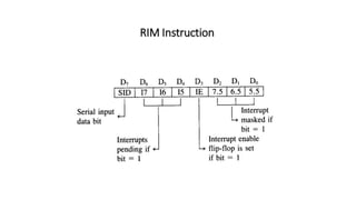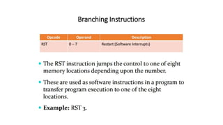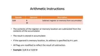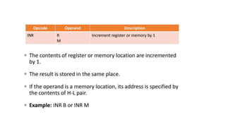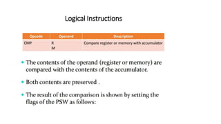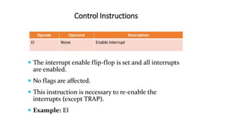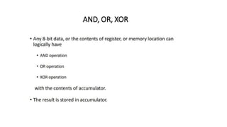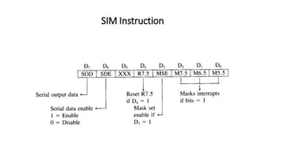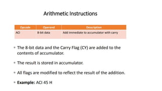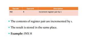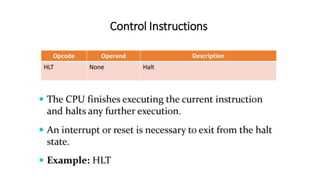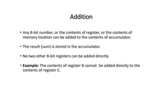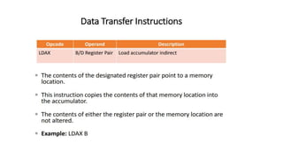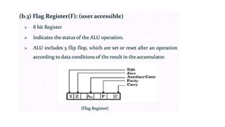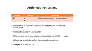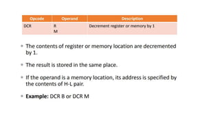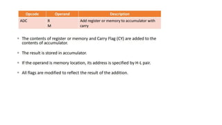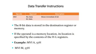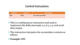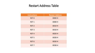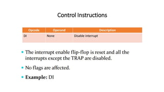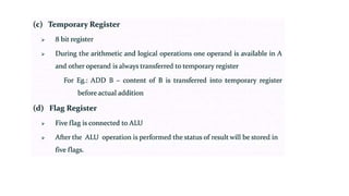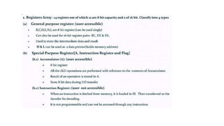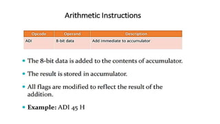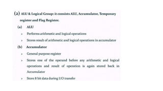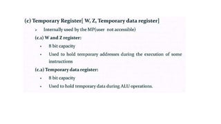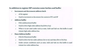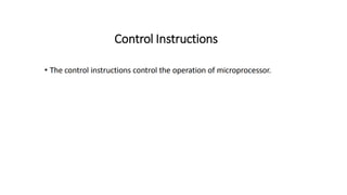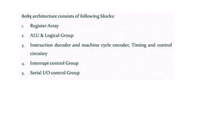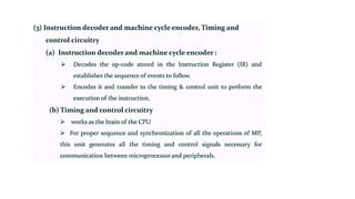 The document provides an overview of microprocessors and microcontrollers. It discusses the basic concepts of microprocessors including the definition, components like the ALU, registers, control unit, memory and system bus. It describes how a microprocessor works and introduces machine language and 8085 assembly language. The later lectures discuss the internal architecture, registers, pin configuration and instruction set of the 8085 microprocessor. It also covers addressing modes, classification of instructions and use of the stack in 8085.