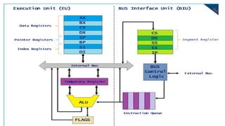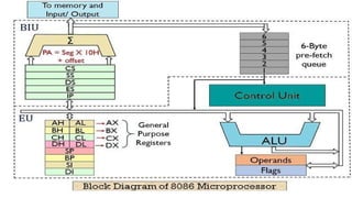 The 8086 microprocessor, introduced by Intel in 1976, is a 16-bit processor with a powerful instruction set and supports two modes of operation - maximum and minimum mode. Its architecture consists of a Bus Interface Unit (BIU) and an Execution Unit (EU), and it utilizes an instruction queue to enhance execution speed. Memory is organized into segments, and it features a 16-bit flag register with various conditional and control flags to manage processor state and execution flow.