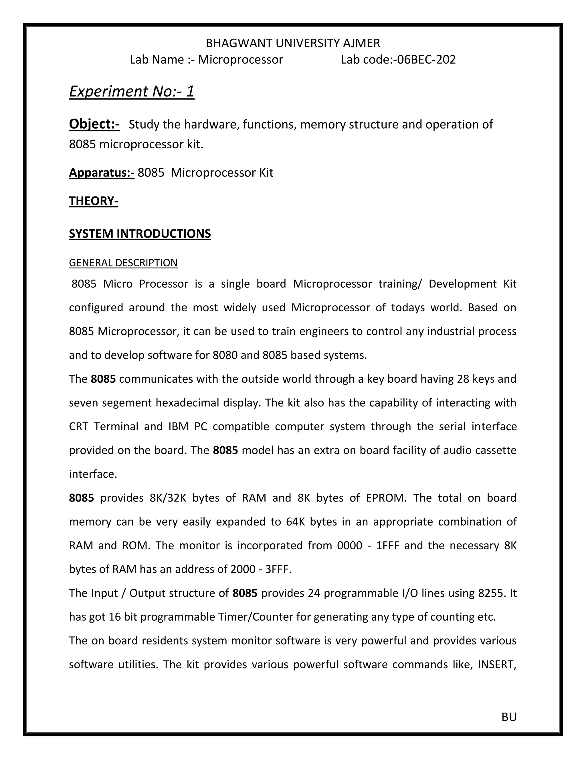 The document describes the hardware, functions, memory structure and operation of the 8085 microprocessor kit. It contains the following key details: