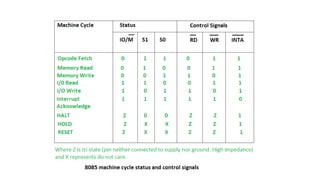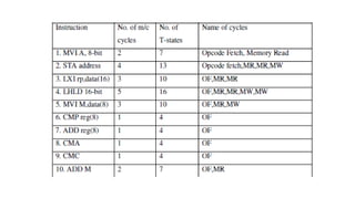 The document discusses timing diagrams of the 8085 microprocessor and the 8255 Programmable Peripheral Interface (PPI). It provides a timing diagram example for the MVI A, 30H instruction in the 8085. It also explains that the 8255 PPI is a general purpose programmable I/O device that can be used to interface a CPU to external devices like ADCs and DACs. The 8255 has three 8-bit ports (A, B, C) that can be programmed as either inputs or outputs. The 8255 operates in either a bit set/reset mode or input/output mode.