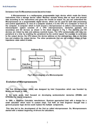This document provides an overview of microprocessor architectures and their evolution from the first microprocessor developed by Intel in 1971 to more recent developments. It begins with an introduction to microprocessor architecture and components of a microcomputer system. Subsequent sections describe the evolution of 8-bit, 16-bit, and 32-bit microprocessors developed by Intel and other companies. Examples of assembly language programs for addition are also provided.
