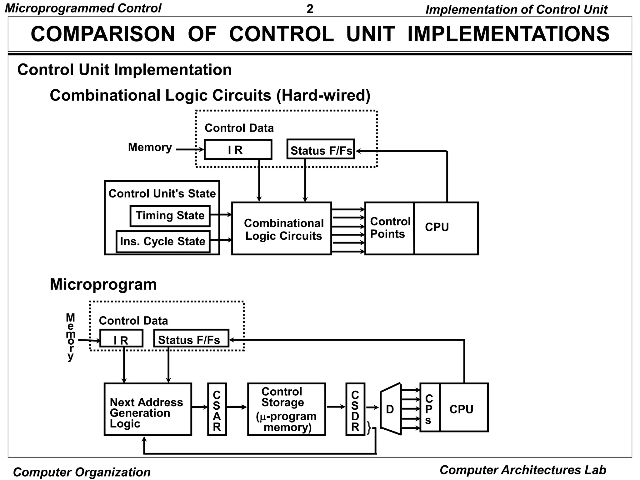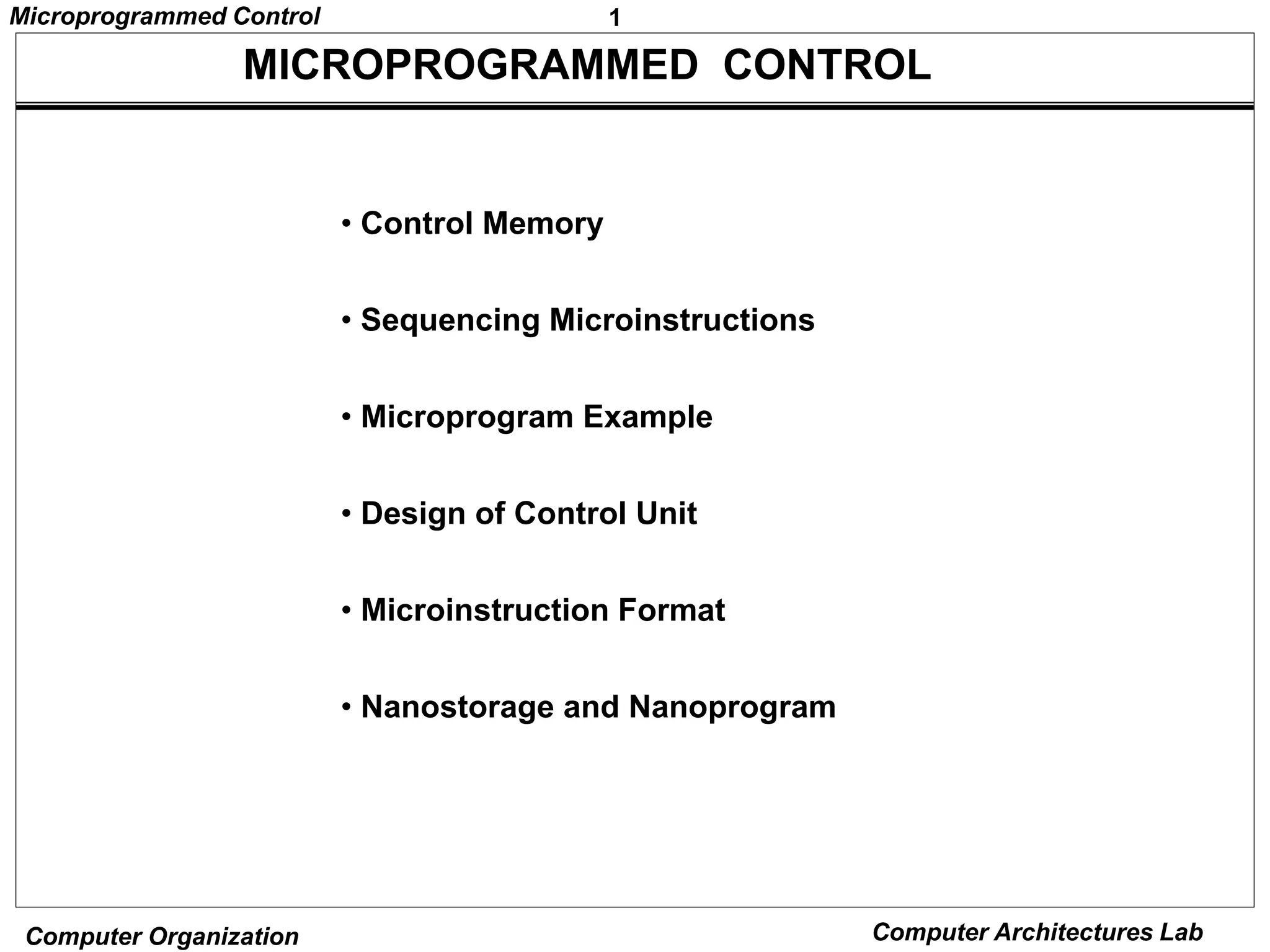 Microprogrammed control units use microprograms stored in control memory to generate control signals for executing machine instructions. A microprogram consists of a sequence of microinstructions, each containing control bits and sequencing information. Common components of microprogrammed control units include control memory to store the microprogram, a sequencer to determine the next microinstruction address, and decoding logic to generate control signals from microinstruction fields.