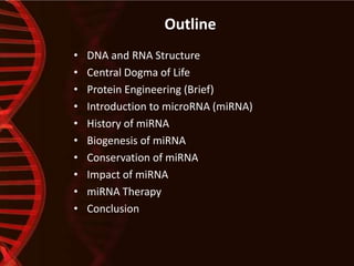 The document provides an overview of microRNAs (miRNAs), discussing their structure, biogenesis, conservation, and role in gene regulation. It highlights the therapeutic potential of miRNAs in cancer treatment and emphasizes the need for further research to harness their capabilities in medical applications. The historical context of miRNA discovery and their impact on protein expression are also explored.