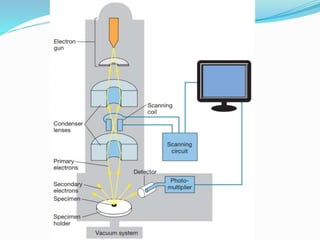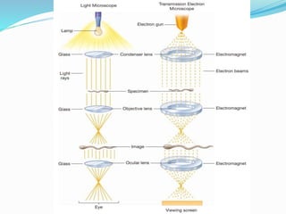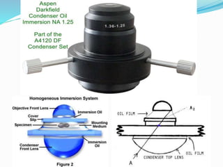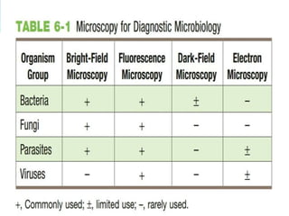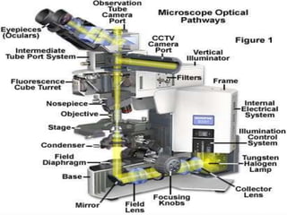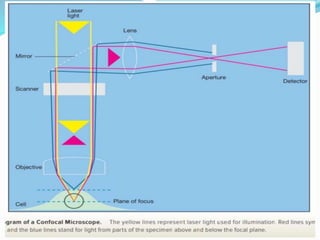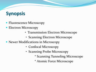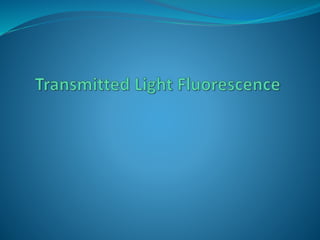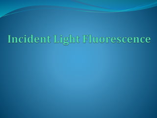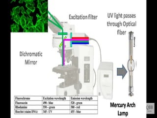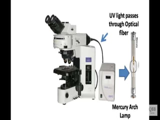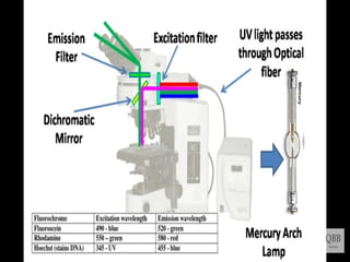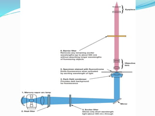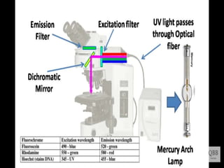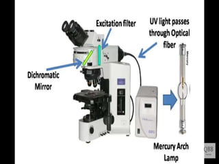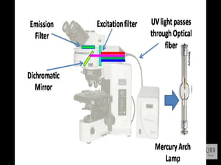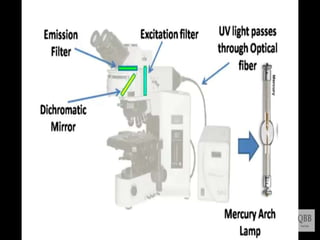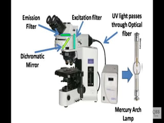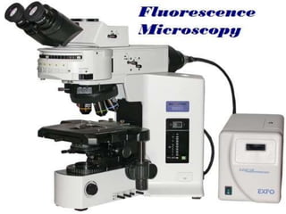 This document provides information on fluorescence microscopy. It discusses how fluorescence microscopy works by using fluorochromes or fluorescent dyes that absorb light of shorter wavelengths and emit light of longer wavelengths. These dyes are used to stain specimens so that they glow under fluorescence microscopy. The document also describes different types of fluorescence microscopy like epifluorescence, transmitted light fluorescence, and confocal microscopy. It discusses applications in microbiology like staining bacteria and fungi, immunofluorescence, and fluorescent in situ hybridization.