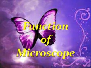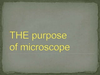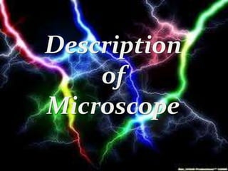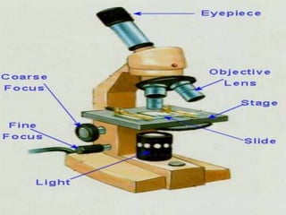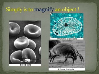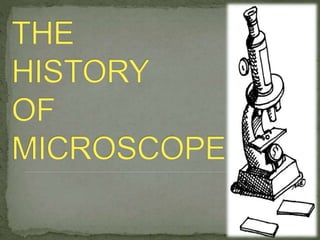 The document summarizes the history and components of the microscope. It traces the invention of the microscope back to 1590 in the Netherlands by eyeglass makers Hans Lippershey, Zacharias Janssen and Hans Janssen. It then discusses key developments like Galileo Galilei constructing the first complete microscope in 1625 and the later inventions of the electron microscope in the 1900s and scanning probe microscope in the 1980s. The document proceeds to explain the main parts of a microscope including the eyepiece, objective lens, stage, slide, and focus, and provides examples of microscope uses such as in biology, criminology, and medicine.
