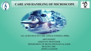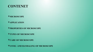 This presentation provides a comprehensive overview of microscopes, their, parts and usage. It explains light microscope, including simple and compound types, as well as electron and fluorescent microscopes. key concepts such as magnification, resolving power, and correct usage instruction are discussed. The document also cover proper care and handling laboratory safety measures, cleaning techniques, and maintenance tips. It is designed for students and educators in sciences and medical fields to promote safe and effective use of microscope