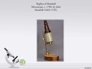 This document provides an introduction to microscopes. It discusses the history of microscopes beginning with Anton van Leeuwenhoek in the 16th century being the first to observe microorganisms. It then describes the basic parts of a classical/light microscope including the ocular lens, stage, objectives, condenser, and illuminator. It also discusses magnification, resolution, working distance, and different types of microscopy including bright field, dark field, phase contrast, and fluorescence microscopes. The document explains how light interacts with lenses and specimens to produce microscope images.