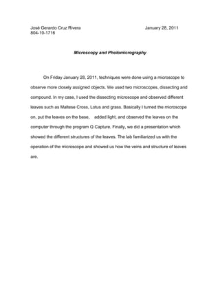 José Gerardo Cruz Rivera observed leaves under a dissecting microscope on January 28, 2011. He used the microscope to more closely examine leaves such as Maltese Cross, Lotus, and grass. Cruz turned on the microscope, placed the leaves on the base, added light, and observed the leaves on a computer program. Finally, he presented his findings which showed the different structures of the leaves' veins. The lab familiarized him with microscope operation and demonstrated the veins and structures of leaves.