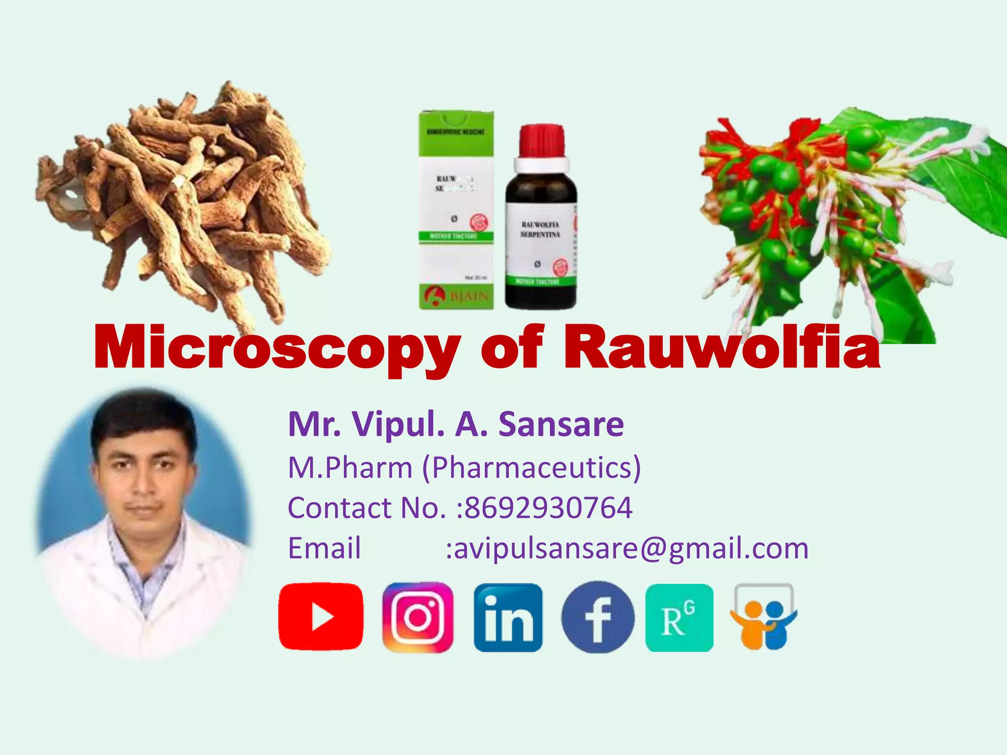 The document discusses the microscopy and chemical composition of Rauwolfia serpentina, including its alkaloids and uses as an antihypertensive and tranquilizing agent. It describes the microscopic features such as cork cells, xylem fibers, and calcium oxalate crystals, with chemical tests for identification. Additionally, it outlines distinguishing characteristics from similar species and asks questions related to the identification of reserpine and adulteration signs.