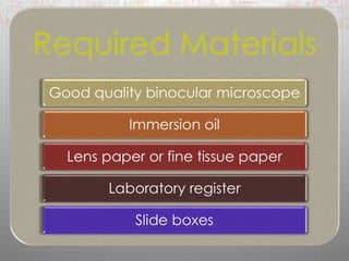 This document provides guidance on examining stained sputum smears under a microscope to detect acid-fast bacilli (AFB) and report tuberculosis (TB) infection status. It describes the proper technique for examining smears at 100x magnification by observing at least 300 fields. Smears should be graded based on the number of AFB observed per field as no AFB, scanty (1-9 AFB/100 fields), 1+ (10-99 AFB/100 fields), 2+ (1-10 AFB/50 fields), or 3+ (more than 10 AFB/20 fields). Inaccurate grading can lead to false negatives or false positives, impacting patient treatment and epidemiological analysis