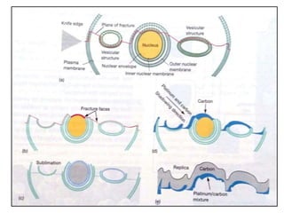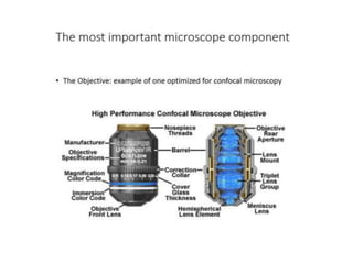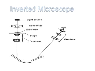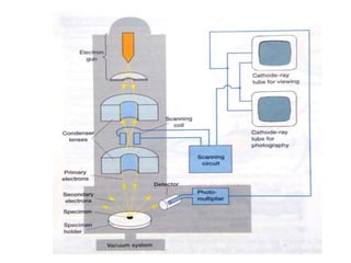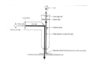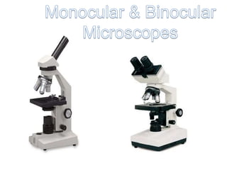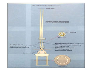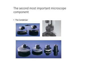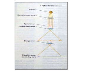 Microscopy is the technical field of using microscopes to view objects that cannot be seen with the naked eye. There are three main types of microscopy - light microscopy, which uses visible light; electron microscopy, which uses electrons; and scanning probe microscopy, which uses a physical probe. Light microscopes like brightfield, darkfield, phase contrast, and fluorescence microscopes are commonly used to view living and stained specimens. Electron microscopes have much higher resolving power than light microscopes and are able to view much smaller structures. Transmission electron microscopes form images using electrons transmitted through thin specimens while scanning electron microscopes form images from electrons emitted from surfaces.