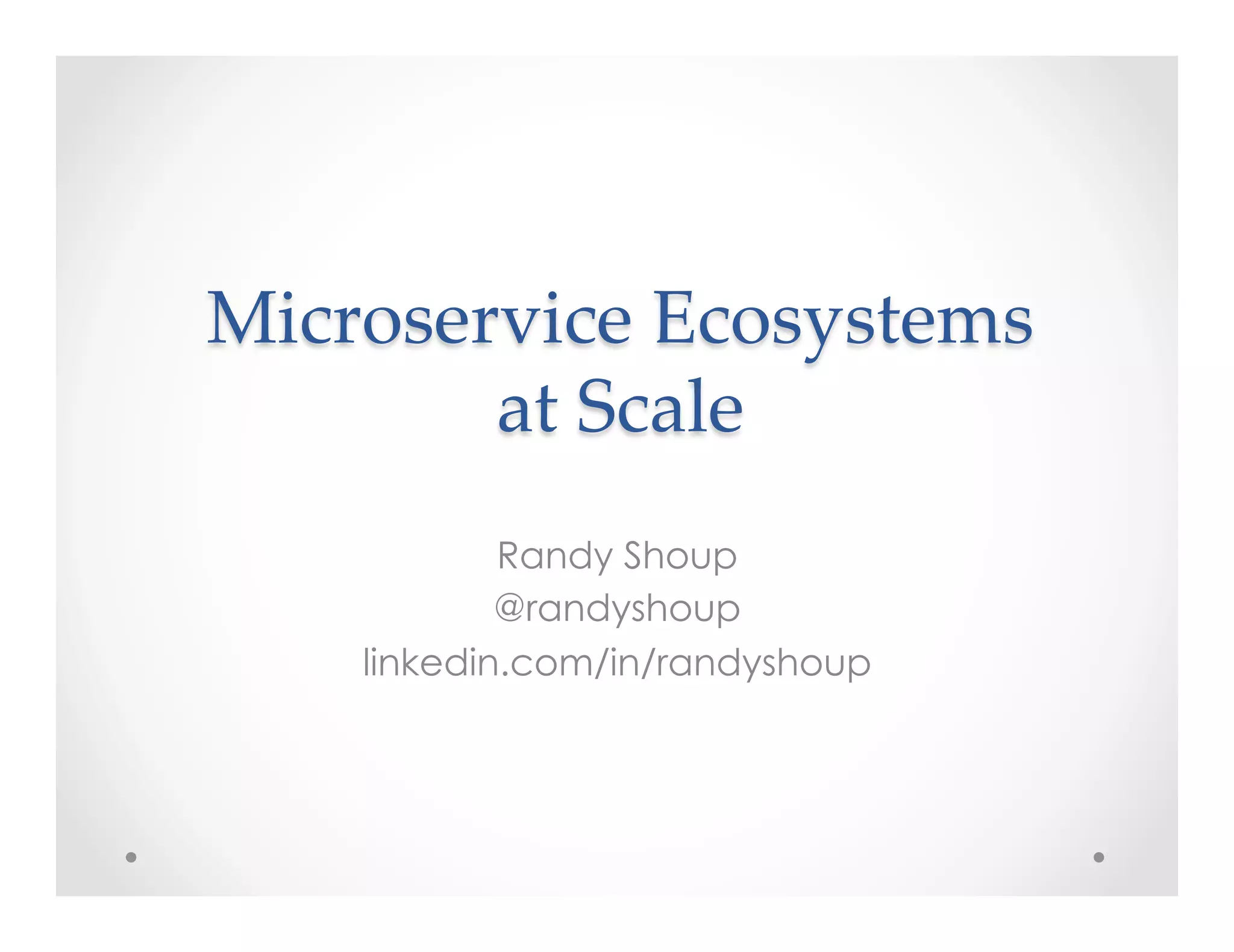 The document discusses microservice ecosystems at scale. It describes how companies like eBay, Twitter, and Amazon evolved from monolithic architectures to microservices. Key points of microservice ecosystems include having hundreds to thousands of independent services with complex relationships, as well as natural selection where new services are created and old ones deprecated. The document outlines best practices for designing, building, and operating individual services within such ecosystems.