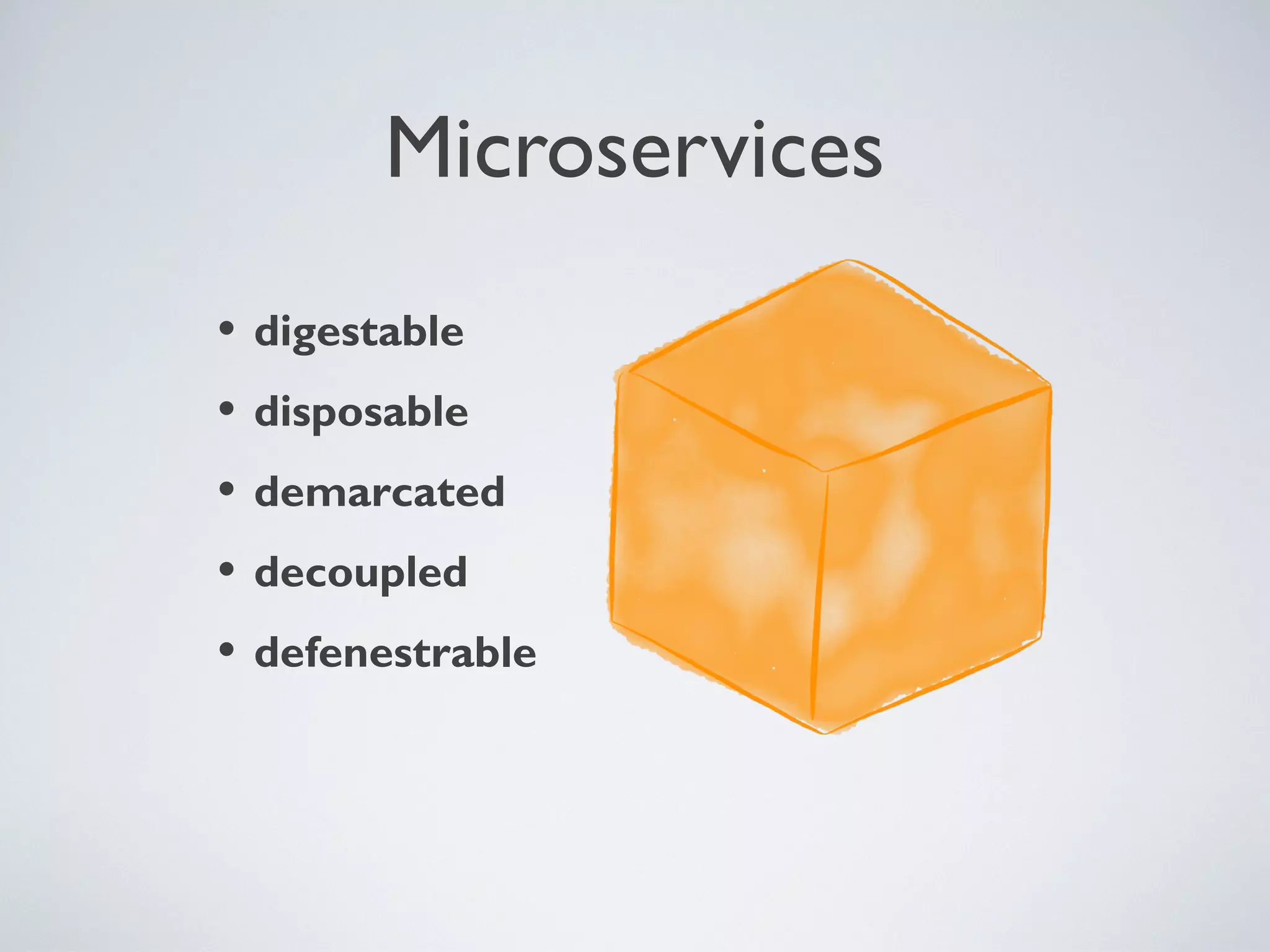 1) Microservices aim to be digestible, disposable, demarcated, decoupled, and defenestrable units that encapsulate specific functions or business capabilities.