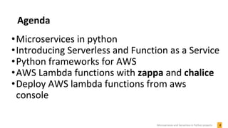 The document discusses microservices and serverless architectures for Python projects. It covers microservices concepts and frameworks like asyncio and GraphQL. Serverless computing with AWS Lambda and frameworks like Zappa and Chalice are explained. Benefits of microservices include separation of concerns while serverless offers automatic scaling and lower costs. Frameworks make it easier to deploy Python code to AWS Lambda.