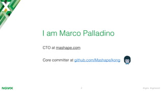 The document discusses the pros and cons of monolithic versus microservice architectures and the role of API gateways in microservice management, using Kong and NGINX as examples. It outlines benefits such as better agility and scalability in microservices, while also addressing challenges like infrastructure complexity and testing difficulties. Additionally, it explains how Kong functions as an API management layer, highlighting its features such as authentication, traffic control, and support for various plugins.