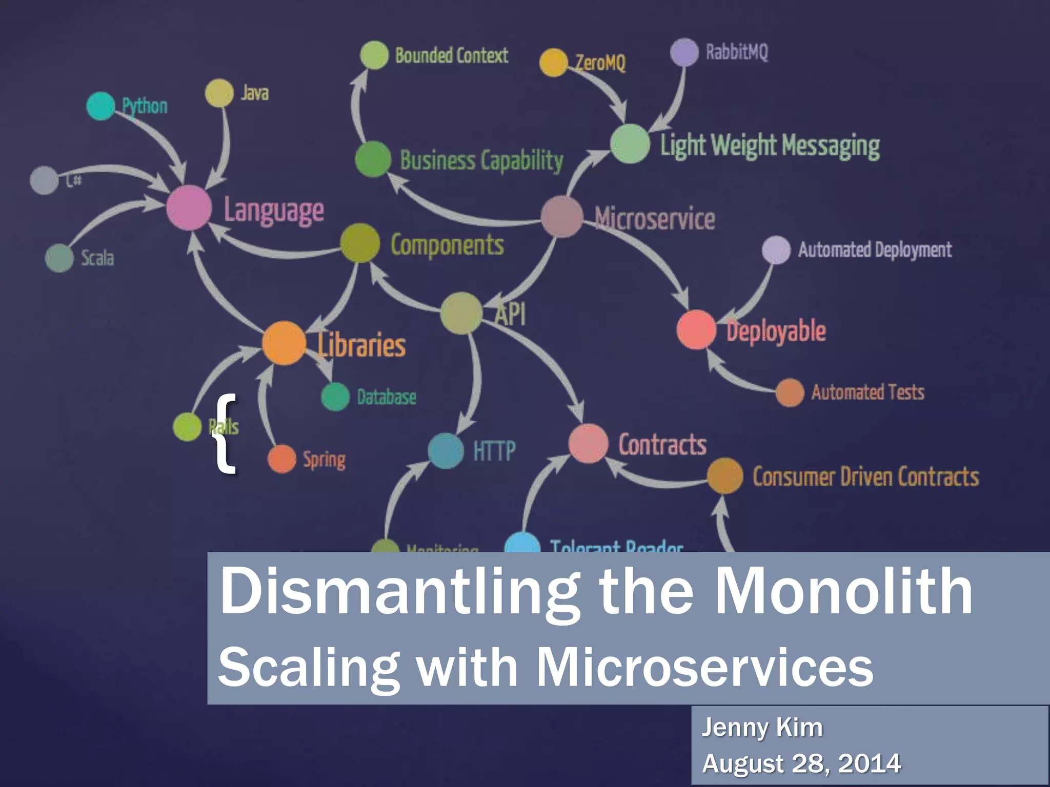 The document summarizes an internal tech talk on migrating from a monolithic architecture to microservices. It discusses: