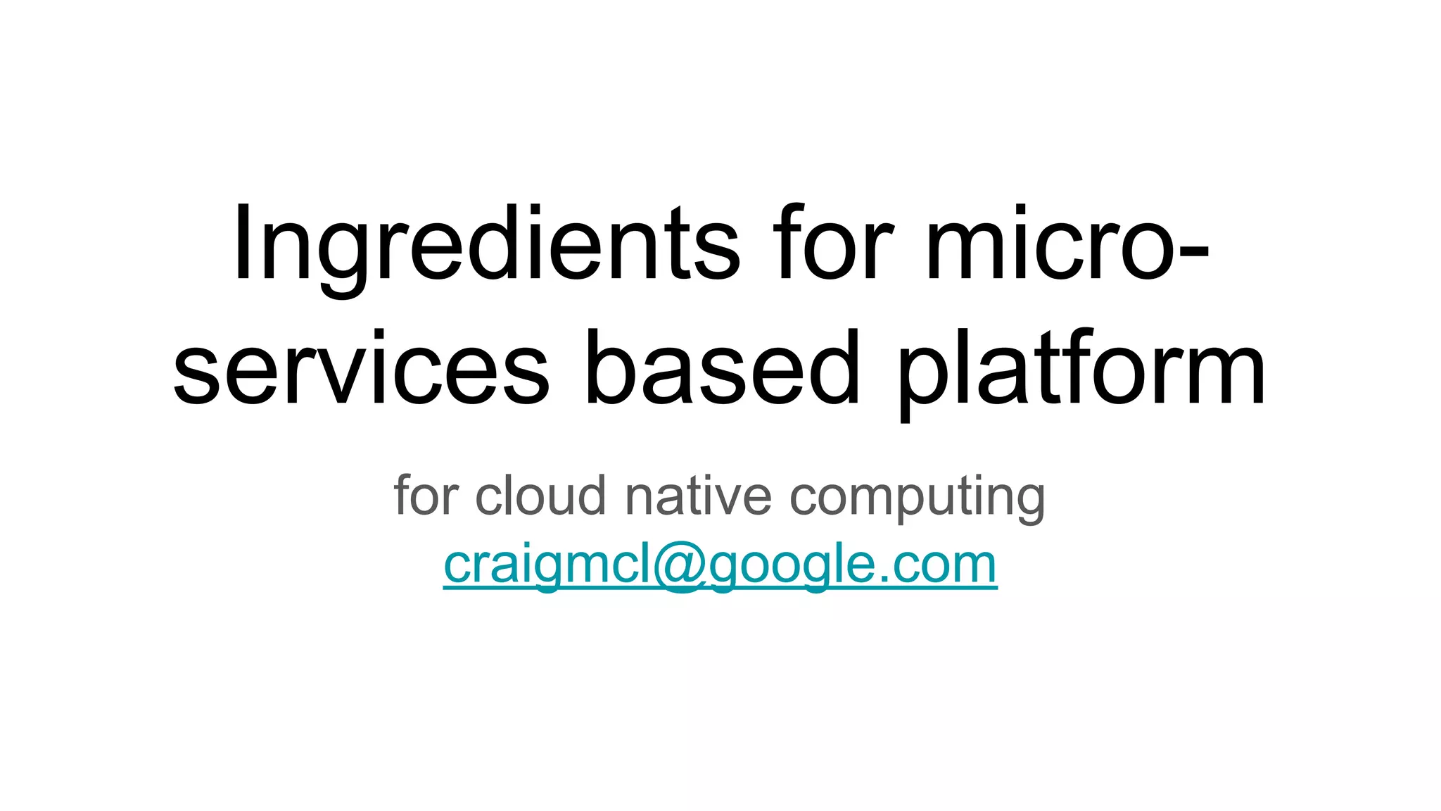 The document discusses the key components and concepts of cloud-native computing, emphasizing microservices, container packaging, and dynamic scheduling. It details the benefits of using Kubernetes for managing microservices, such as improving agility, automation, and orchestration in application development. Additionally, it covers how services are defined, discovered, and managed within Kubernetes clusters, highlighting features like service scoping and DNS integration.