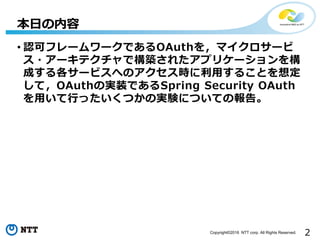 All Rights Reserved. • Spring BootやSpring Security OAuthを使った Microservicesなアプリケーションで,サービス(リ ソースサーバ)から他のサービスの呼び出しでも,エン ドユーザが認可した範囲に限定したアクセスを行う。 実現したいこと(1) クライアント エンドユーザが認可した範囲での限定したアクセス Microservicesでいうところのサービスを OAuthのリソースサーバとして実現