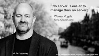 This document discusses serverless microservices using AWS services like Lambda, API Gateway, S3, and DynamoDB. It notes that managing servers for microservices can be difficult due to provisioning, patching, updates, and failures. Serverless computing removes these problems by running code without provisioning servers and providing automatic scaling and high availability. The document provides an example serverless microservices architecture using AWS services and shares a case study of building a web and mobile application with Node.js microservices, Angular for the web app, and Ionic for mobile, all deployed serverless on AWS.