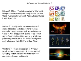 Microsoft is a multinational software company founded in 1975 by Bill Gates and Paul Allen in the United States. As an allied related operating model, Microsoft owns various products across different electronics categories, including computers, smartphones like Windows phone, the Xbox 360 gaming console, and tablets. The company is organized into sections like Microsoft Office for productivity software, Microsoft Gaming for Xbox and games, and Windows for the PC operating system. Key competitors of Microsoft include Apple, Oracle, and Google.